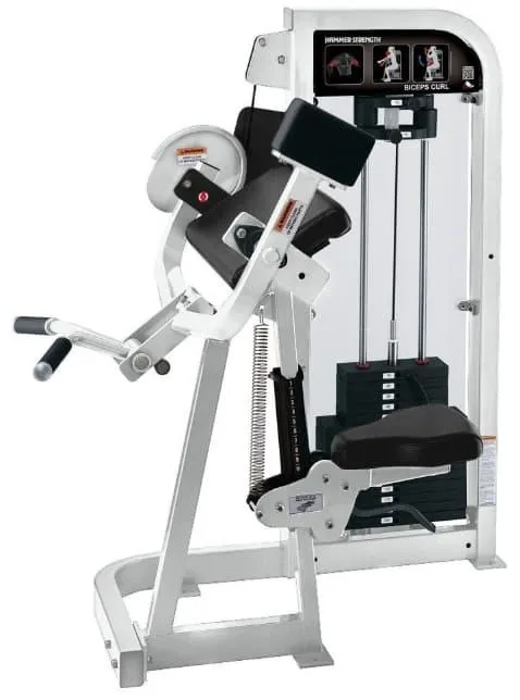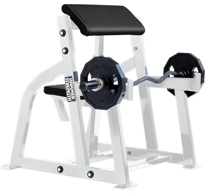 Hammer Strengths preacher curl is a bicep curl variation performed seated while resting the upper arms on a slanted pad to isolate the biceps. By locking the elbows and shoulders in place, it eliminates momentum and ensures maximum muscle engagement. You can use an EZ bar or dumbbells to build bicep, brachialis, and forearm strength.