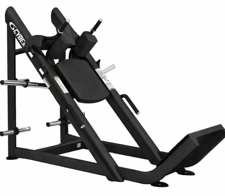 The Cybex Plate-Loaded Hack Squat is a 45-degree angled machine engineered for intense lower-body training, specifically targeting quads, glutes, and adductors. It features a smooth, fully enclosed linear bearing system, a large non-skid footplate, and adjustable back/shoulder pads to minimize spinal load.