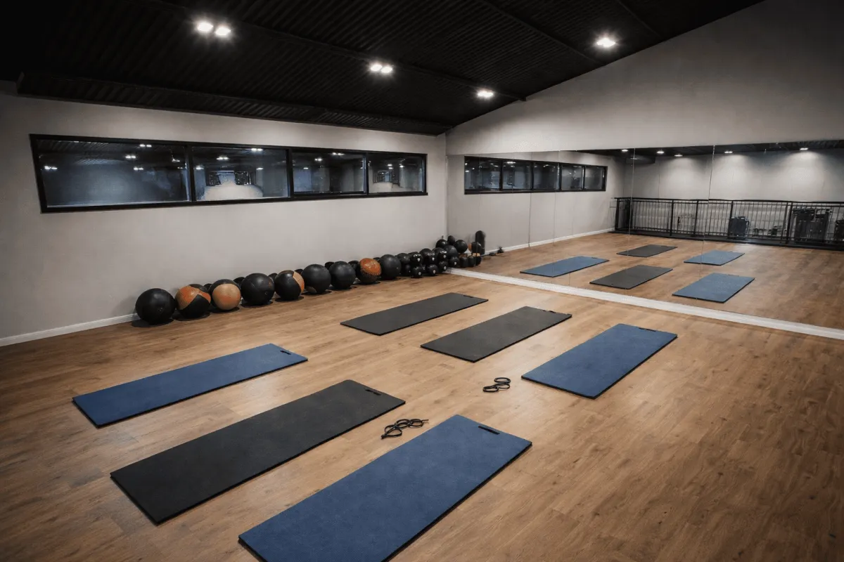 Dedicated studio space for classes, stretching, and focused sessions.